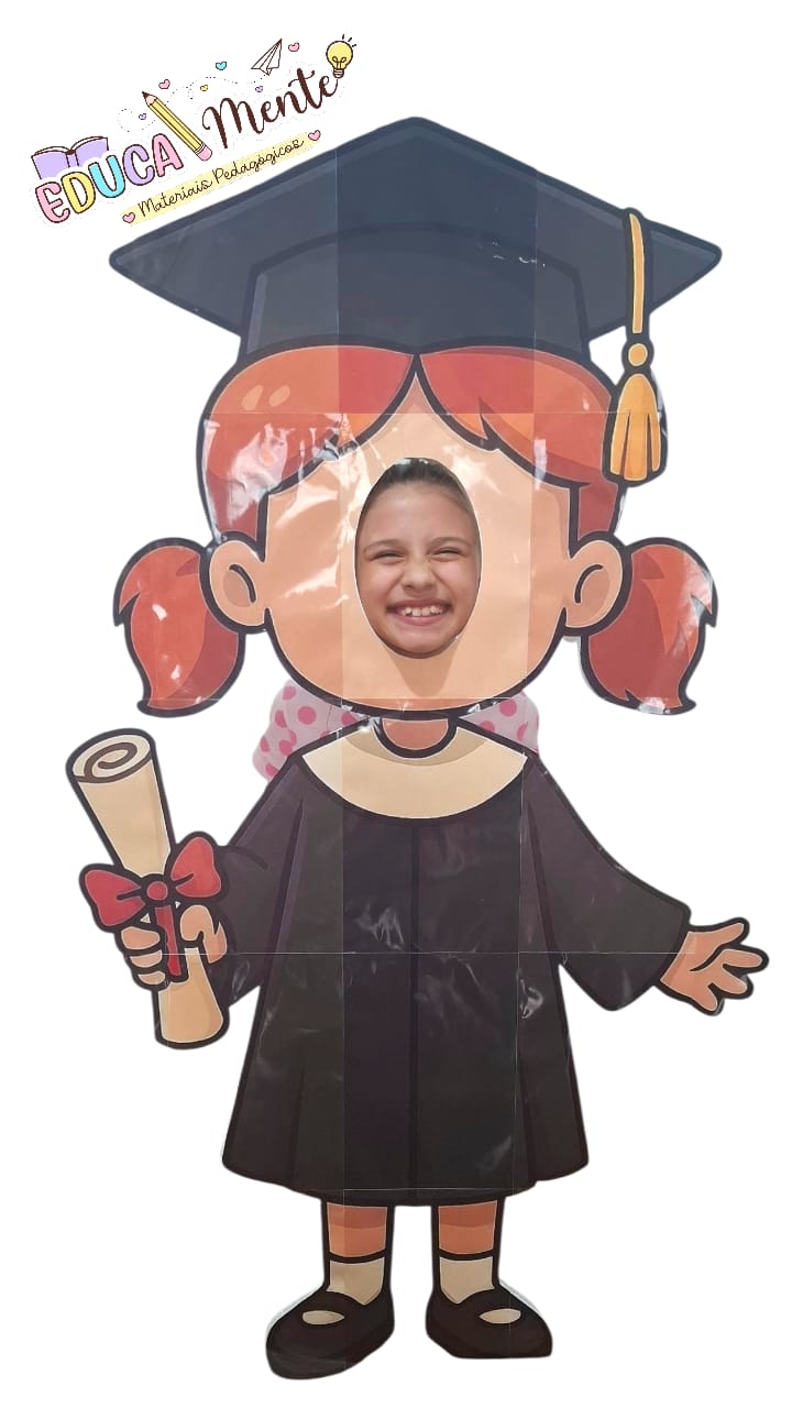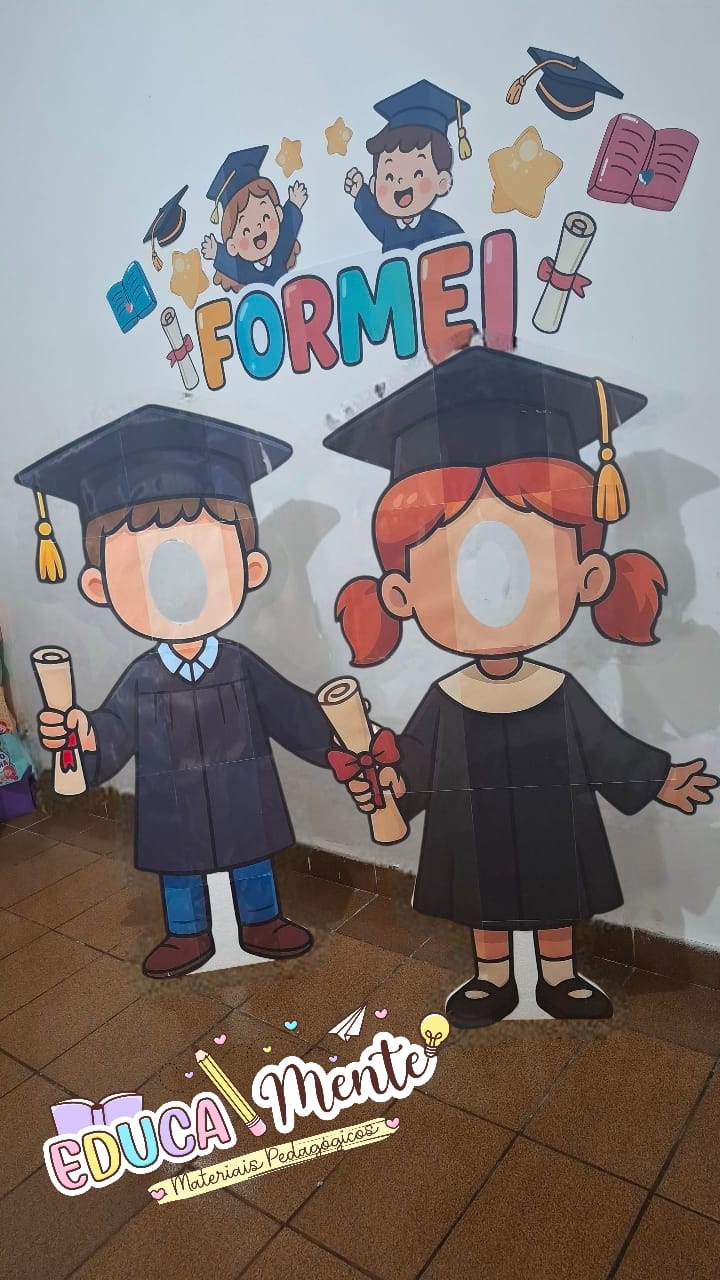 Este material traz 2 modelos de totens interativos — um menino e uma menina formandos, perfeitos para as crianças colocarem o rostinho e tirarem fotos divertidas e cheias de lembrança! 📸✨